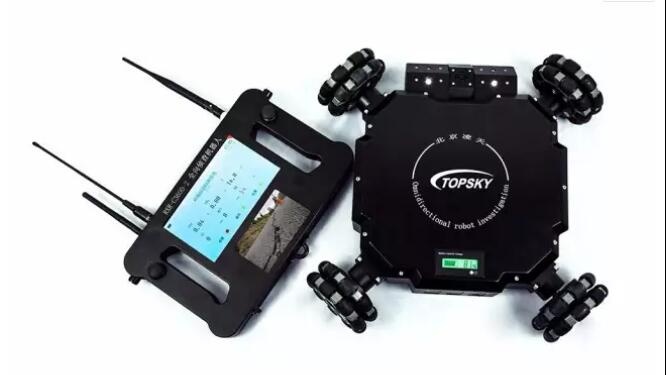 四輪全方位升降偵察機器人是一款集全方位視頻監控、可升降云臺、有毒有害氣體探測系統為一體的移動偵查平臺。體積小,有較強的攀爬和越障性能,可部署在狹小空間,威脅、危險區域執行隱秘偵察和監測任務。配裝的后場手持終端實時顯示移動端全景圖像,操作人員可以隱蔽觀察控制,通過手持端圖像或數據信息完成前端環境判斷,降低了在建筑物、地下室、山洞、隧道、街巷和可疑氣體泄漏區域內行動的危險性。