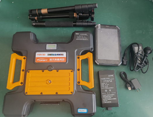 三維雷達生命探測儀由三維雷達探測器、操作終端(平板)、三角架、備用電池等組成。