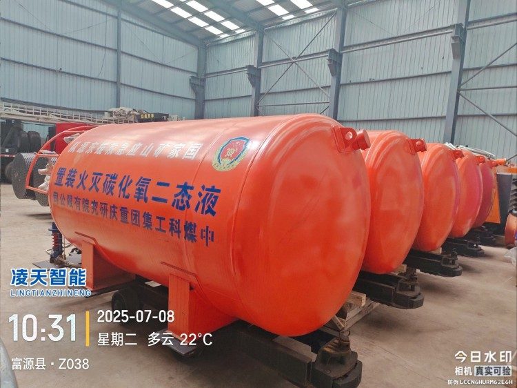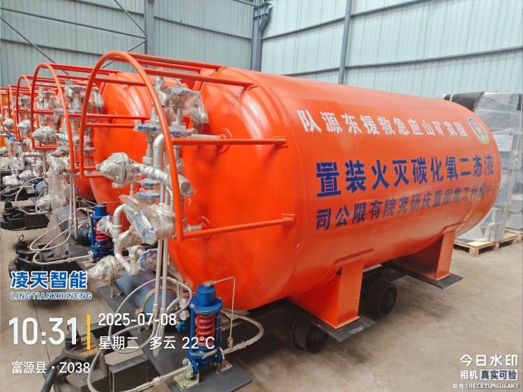 液態二氧化碳滅火裝置,采用平板車為運載平臺,搭載液態二氧化碳滅火模塊,采用液態二氧化碳為滅火劑,運輸至井下火區近附,經自增壓調控系統實現罐內穩壓,并通過遠距離輸送管路將液體從罐內向密閉火區噴射,利用其急速膨脹氣化和吸熱效率高的物理特性,可實現惰性降氧,吸熱降溫,吸附阻化等功能,從而可快速進行井下煤層自燃火災的預防與撲滅等。