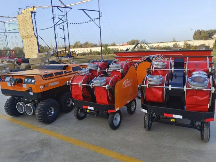 供排水機器人配有大口徑水帶收放車,采用電動快速鋪設系統,操作簡單,實用性強等特點,解決了人力收放水帶的不便利性,增加了救援時間。