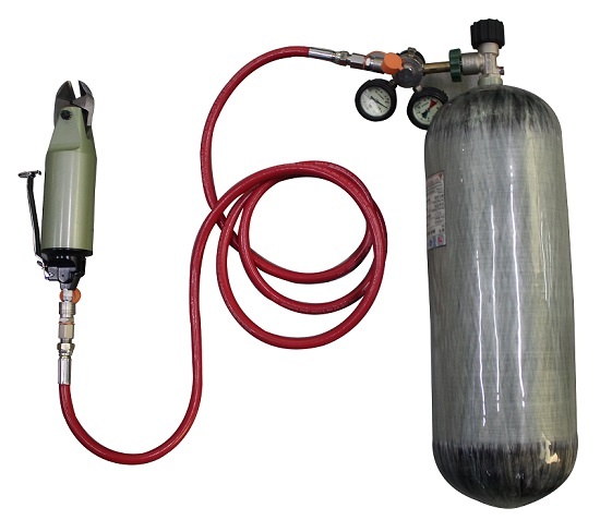 礦井錨護網(wǎng)的拆除比較復(fù)雜繁瑣,常規(guī)的辦法采用手動鋼筋鉗,存在勞動量大、效率低等諸多問題,QSD-4.5礦用氣動剪斷裝置(氣動鐵絲速斷器)是一款能連續(xù)快速剪切鐵絲的設(shè)備,采用氣動原理,由井下壓風管道提供動力,切割范圍:鐵絲、鋼絲、錨護網(wǎng);最大剪斷直徑: