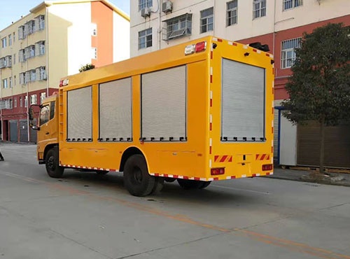 廂體外部鋼材為優(yōu)質(zhì)冷軋鋼板,內(nèi)襯優(yōu)質(zhì)冷軋鋼板折彎骨架,工藝先進(jìn),強(qiáng)度牢固。廂體為全密封結(jié)構(gòu),具備運(yùn)輸、防雨、防腐、防火、防銹要求。車廂尾部安裝鋁合金卷簾門。發(fā)電機(jī)組進(jìn)排風(fēng)消聲處理,消聲器做降噪處理。車廂水泵兩側(cè)設(shè)開門,發(fā)電機(jī)進(jìn)風(fēng)口和排風(fēng)口防雨百葉窗,工作門下,尾部設(shè)有隱藏式抽拉梯,與車廂底板框架連接。