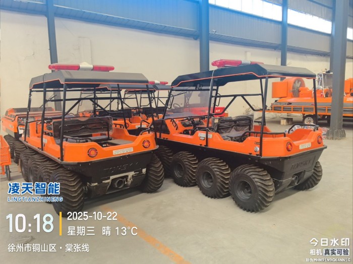 在復雜惡劣的地形條件和自然環境下,水陸兩棲全地形車可以讓搜救隊員和攜帶的救援裝備快速到達救援現場,減少徒步帶來提供消耗,完成最后一公里最好五分鐘緊急救援任務。水陸兩棲全地形車可配備點到絞盤、救援擔架組件、探照燈、警示燈、警報器、脫鉤、破拆工具等裝備, 給救援團隊提供救援保障,更安全的解救傷員和疏散群眾。
